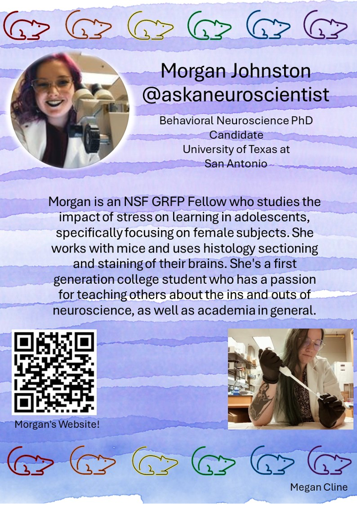 Morgan Johnston is a Neuroscience Scholars Program Associate (2022-2024) through the Society for Neuroscience. She is a graduate student at the University of Texas, San Antonia who studies impact of stress on learning.