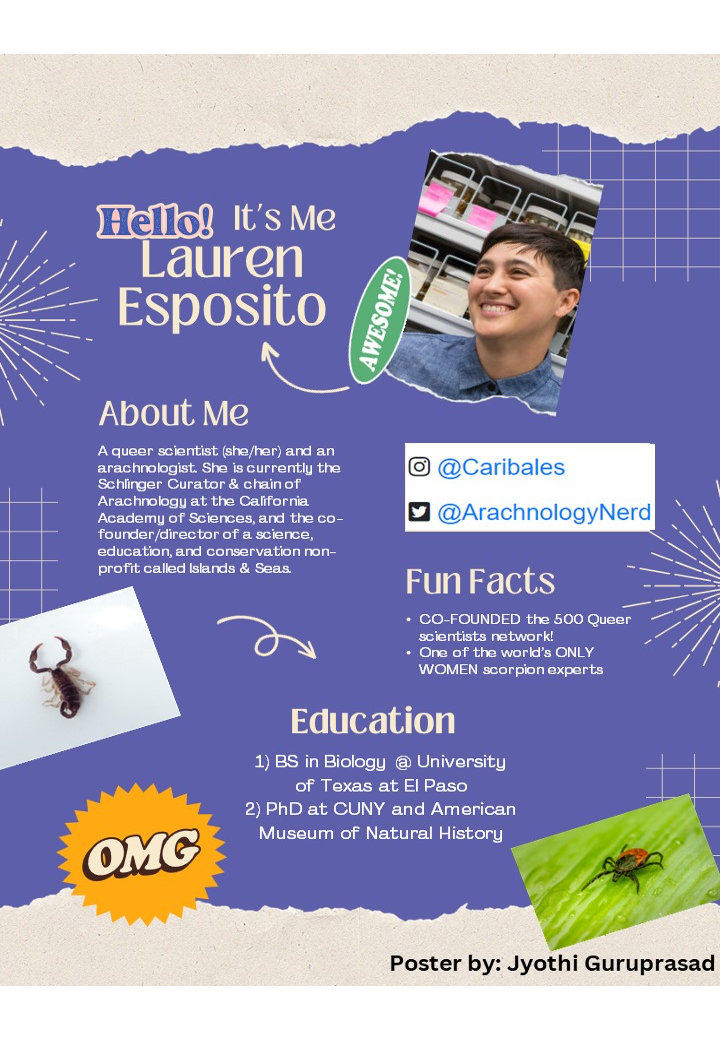Lauren Esposito is the assistant curator and Schlinger chair of Arachnology at the California Academy of Sciences. She is the co-founder of the network 500 Queer Scientists.