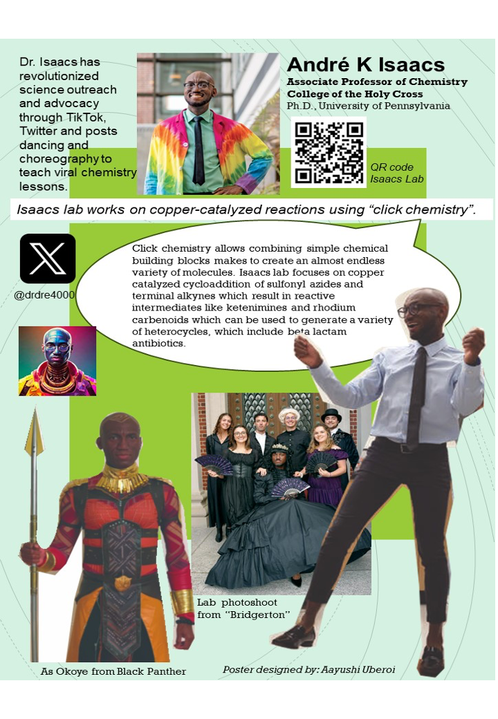 Dr. Isaacs is a professor of chemistry researching organic and synthetic chemistry at the College of the Holy Cross. He is also a queer science communicator mainly using TikTok and Twitter, where he posts dancing and choreography videos to teach chemistry lessons.