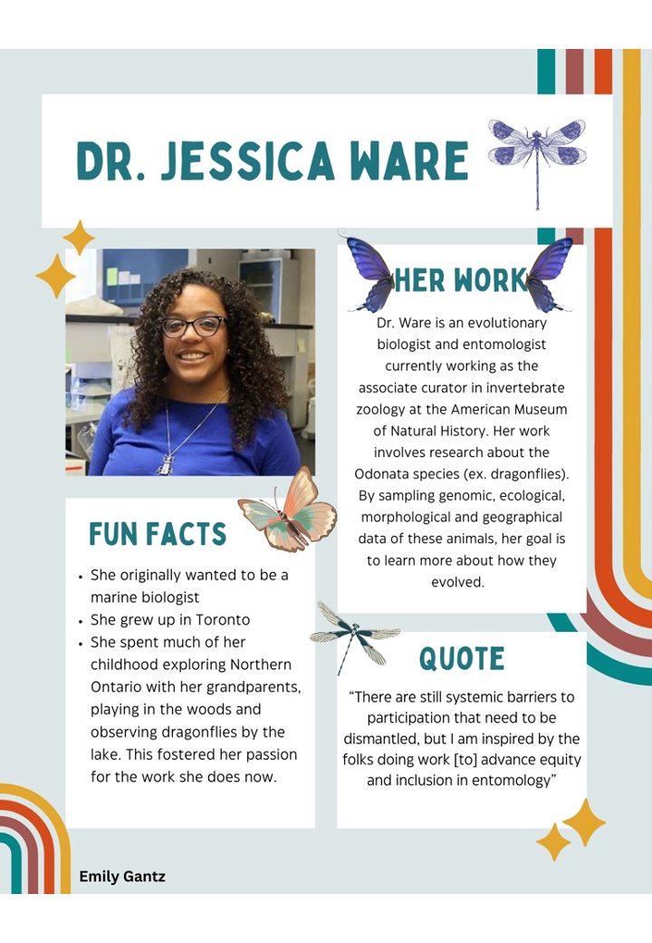Jessica Ware is an Associate Curator and the current Division Chair in the Division of Invertebrate Zoology at the American Museum of Natural History. Dr. Ware’s research focuses on the evolution of behavioral and physiological adaptations in insects, with an emphasis on how these occur in Odonata (dragonflies and damselflies) and Dictyoptera (termites, cockroaches and mantises).