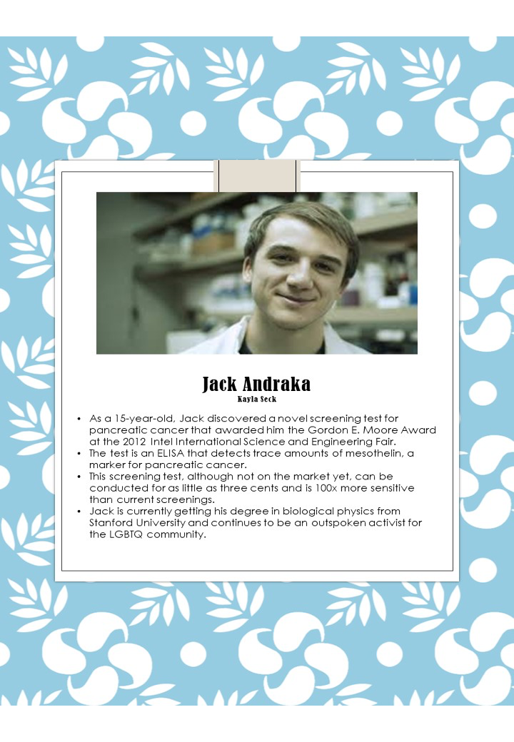 When he was 15, Jack Andraka developed an early detection test for pancreatic, ovarian and lung cancers. He won the top prize in the 2012 Intel Science Fair for his invention, which costs only three cents and works in five minutes, and has since been recognized around the world for his accomplishment.